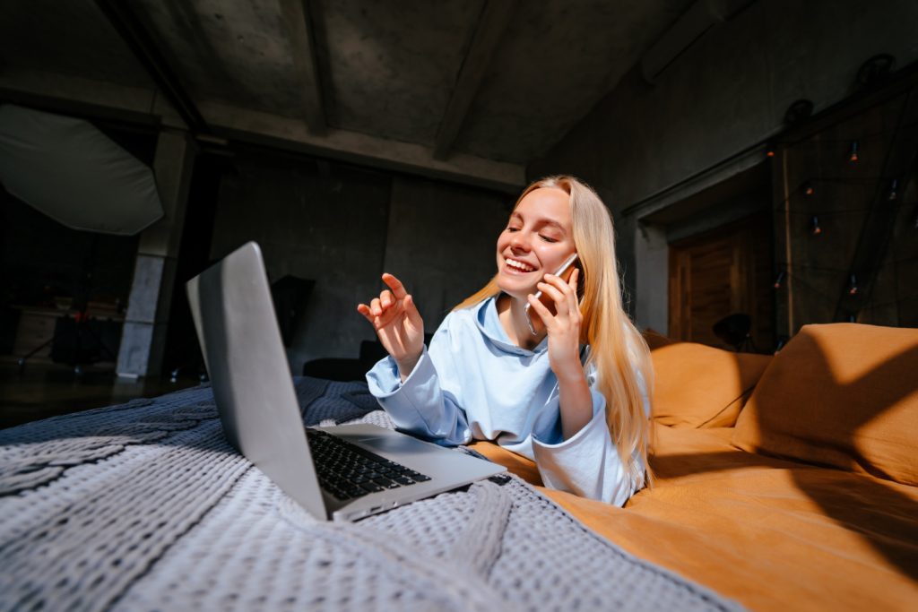 A woman using her phone at a desk, surrounded by art supplies and a laptop, in a creative workspace.